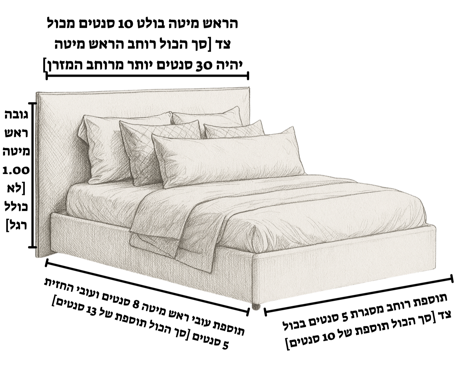 • גובה ראש מיטה: 1.00 (לא כולל רגליים)