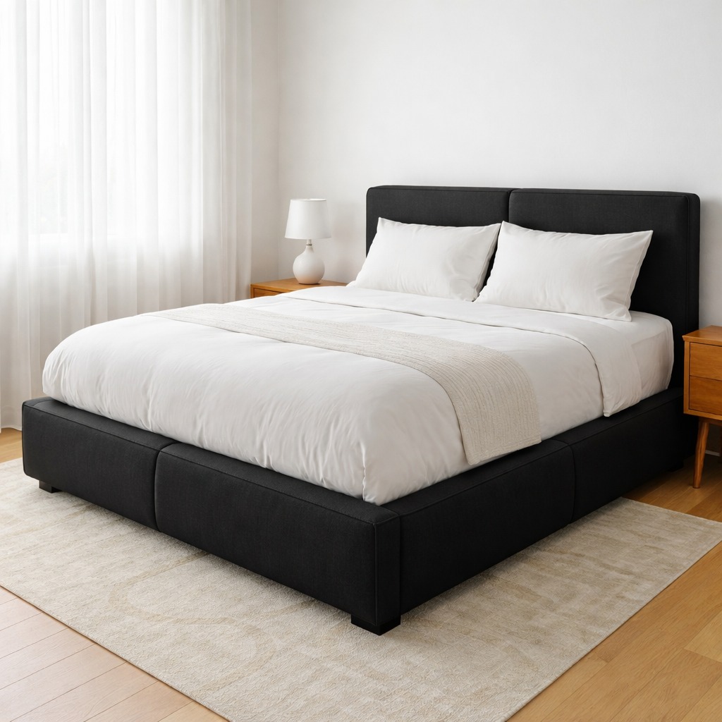 מיטה בעיצוב מינימליסטי ואלגנטי עם קווים רכים ומדויקים.