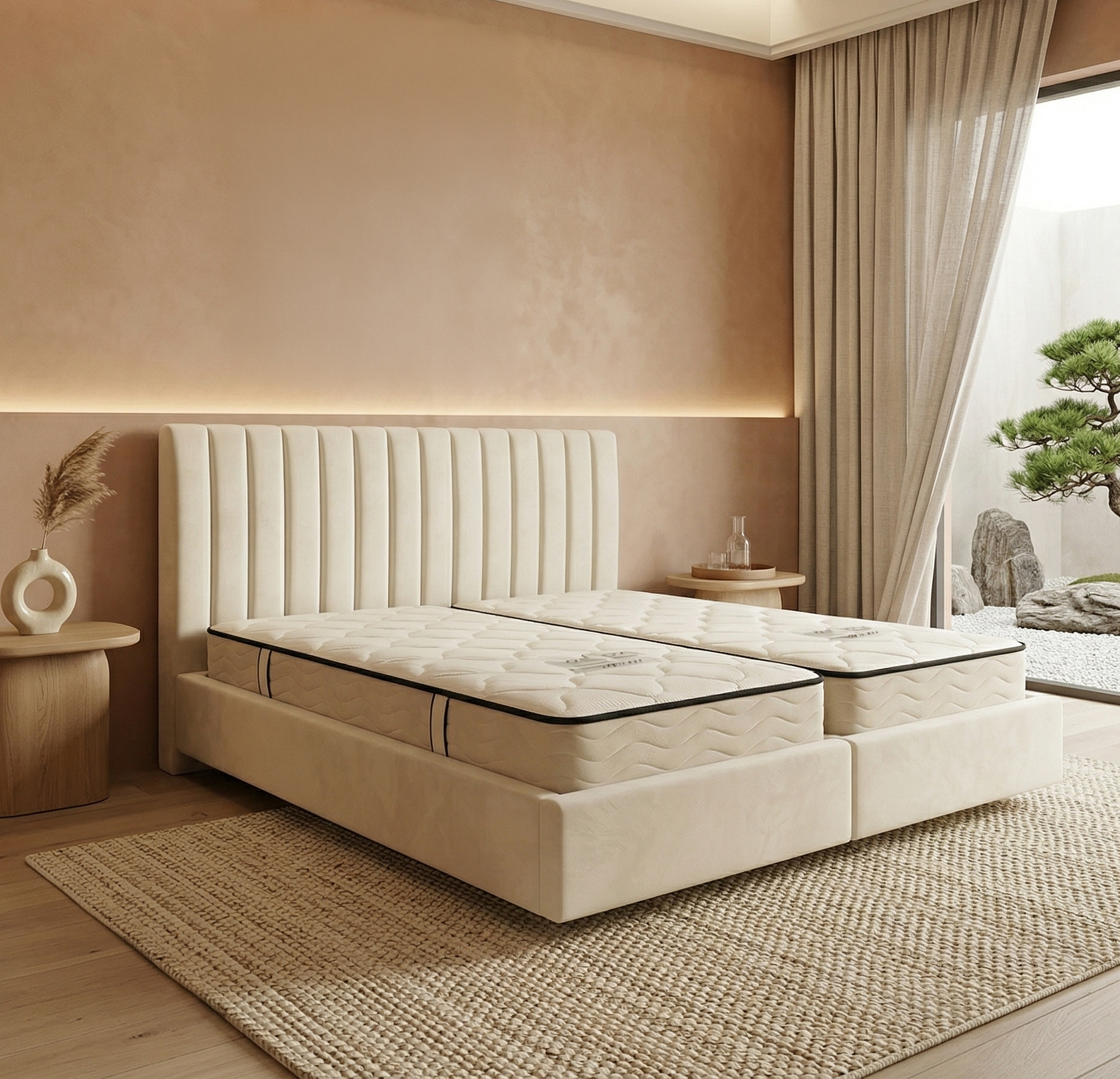 מיטת ספירא מביאה אליכם חוויית שינה יהודית אחרת, המשלבת יוקרה בלתי מתפשרת ונוחות מירבית. המיטה מתאפיינת בראש מיטה גבוה ומרשים בתיפורי פסים אנכיים מעודנים, המעניקים לה מראה גבה, נקי ומלכותי, מרופד בקטיפה רכה בגוון שמנת-חולי חם כפי שנראה בתמונה.