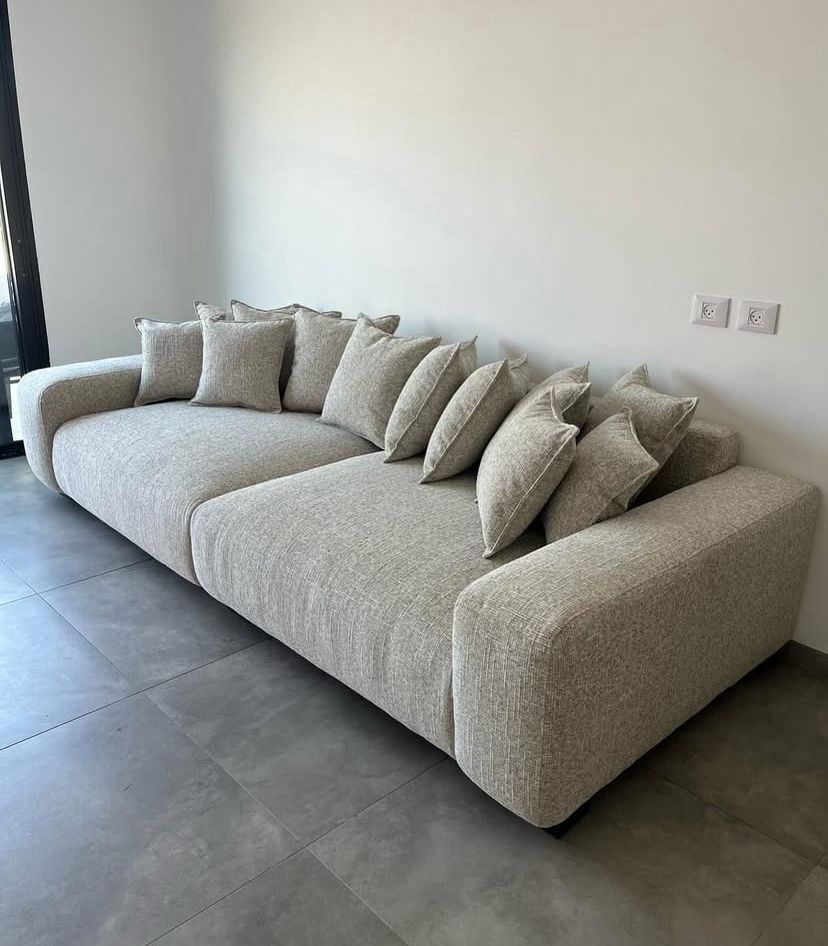 דגם אסיה – ספת רביצה רחבה ונוחה בעיצוב מודרנידגם אסיה היא ספה מרווחת בעיצוב מינימליסטי ונקי, שמעניקה תחושת חמימות ורוגע לכל חלל. מרופדת בבד איכותי בגוון בהיר ונעים, עם קווים רכים ועבודת תפירה מדויקת שמדגישה את איכות הייצור. הספה מגיעה עם 12 כריות תואמות במגוון גדלים, להשלמת חוויית נוחות מושלמת ולעיצוב עשיר ומזמין. ✦ ניתן להזמין בהתאמה אישית – בחירת בד, צבע ומידות לפי הצורך.